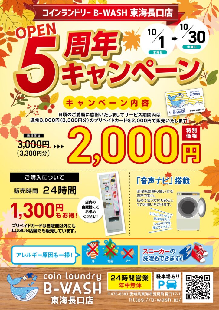 B-WASH 東海長口店ではOPEN5周年キャンペーンを行います!