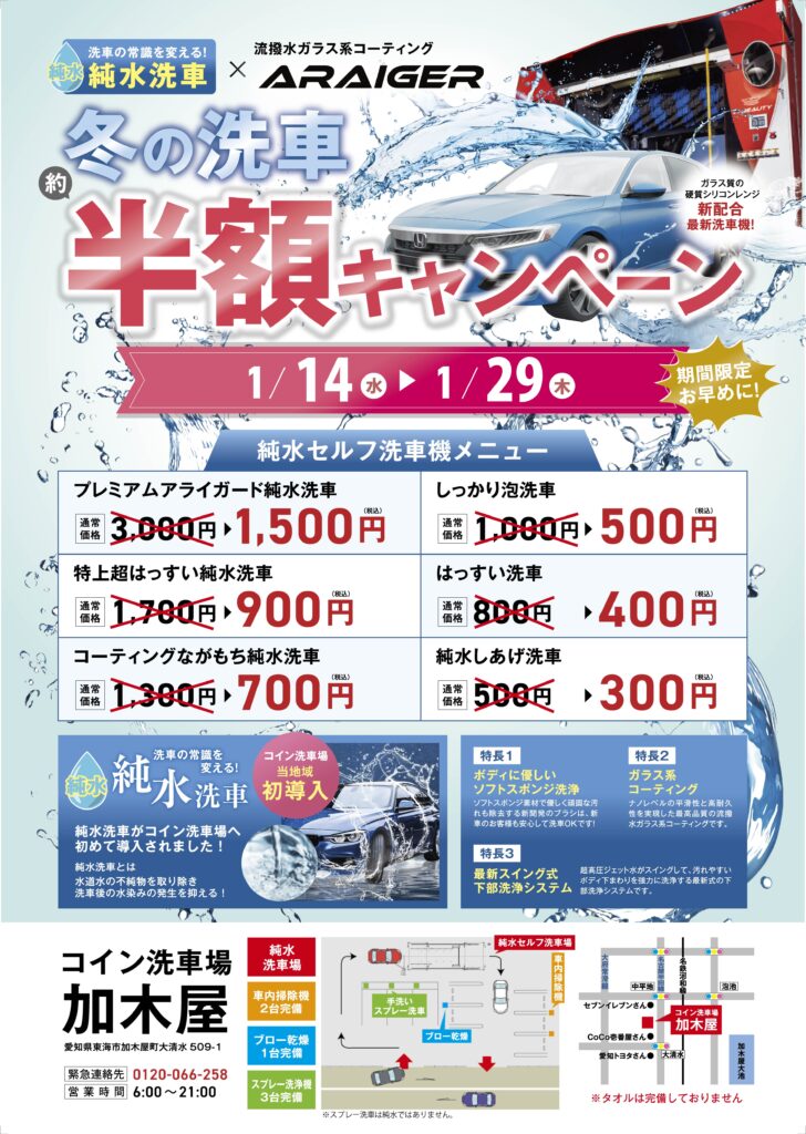 コイン洗車場 加木屋 冬の約半額キャンペーン開催!